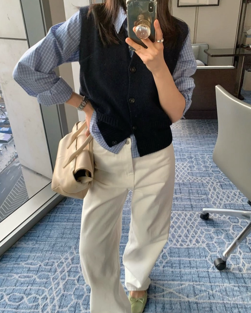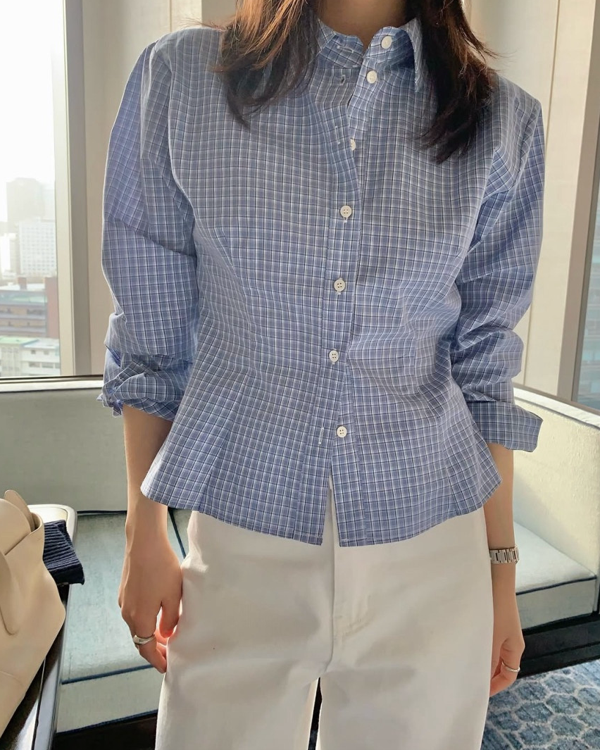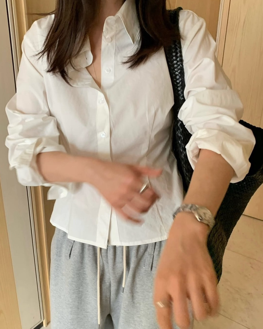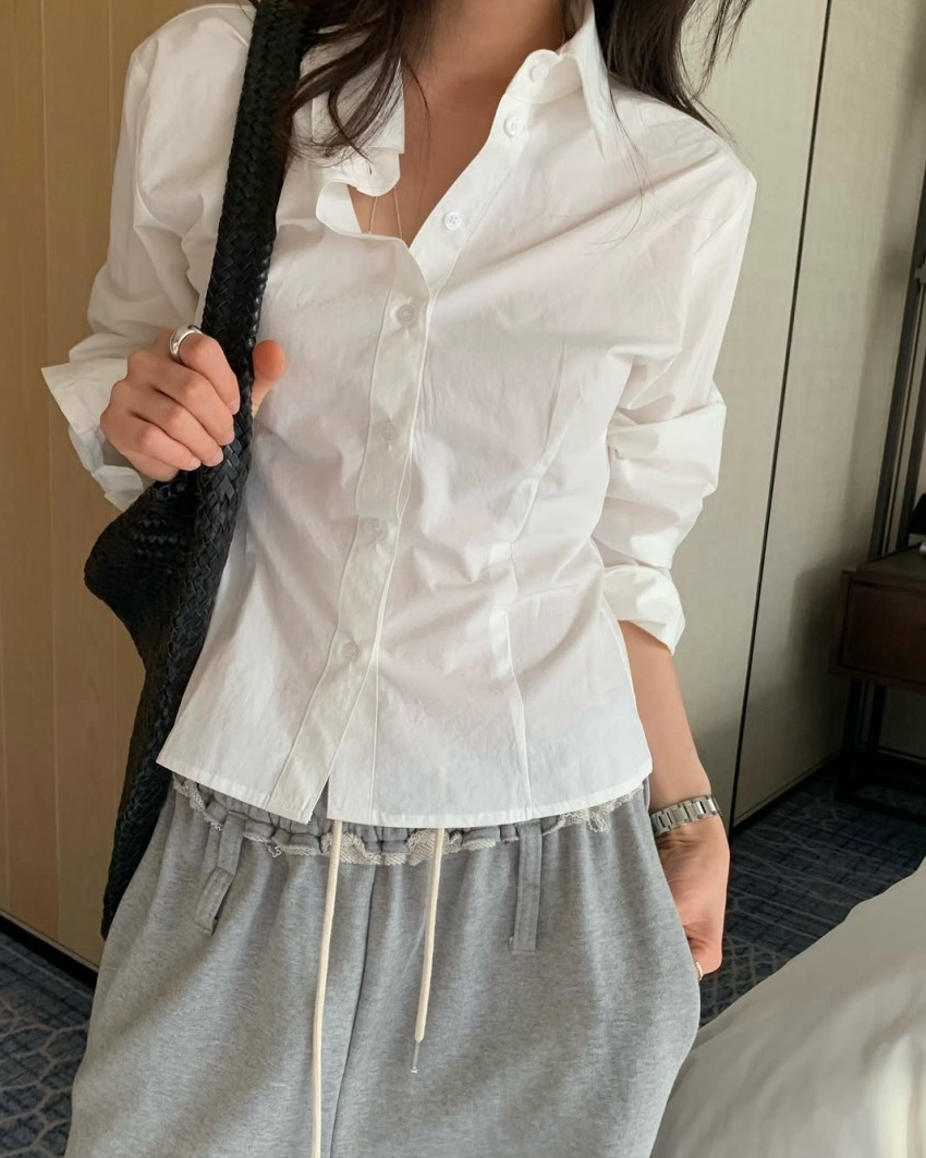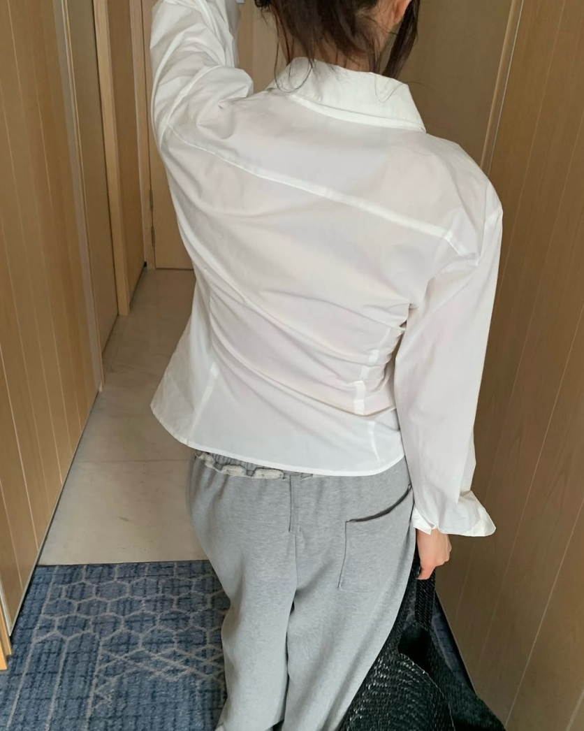 Made from lightweight cotton fabric, it features a semi-cropped length and pintuck detail at the waist to create a slim waistline.