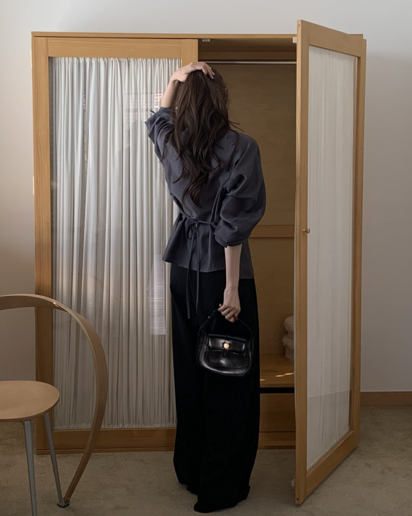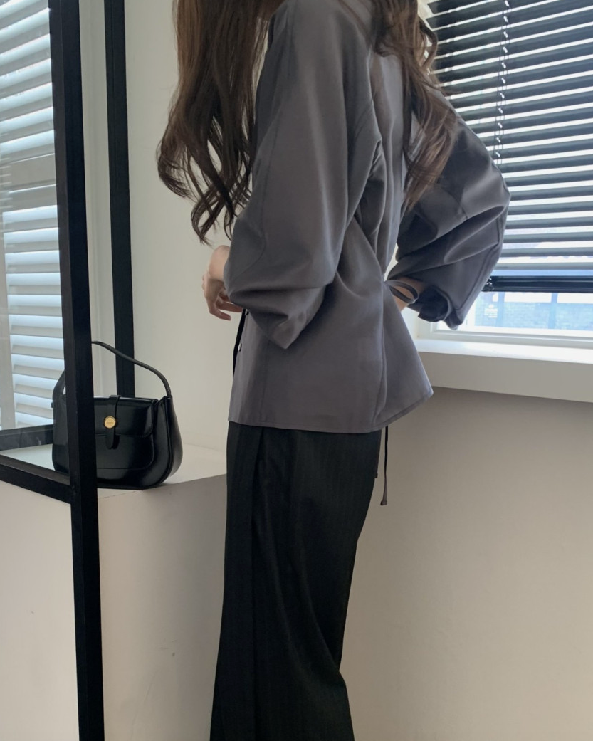 Made from silky Tencel fabric, this piece features comfortable raglan sleeves and a classic collar design with a button-down closure. It also includes a detached waist sash to create a slimmer, more defined waistline.